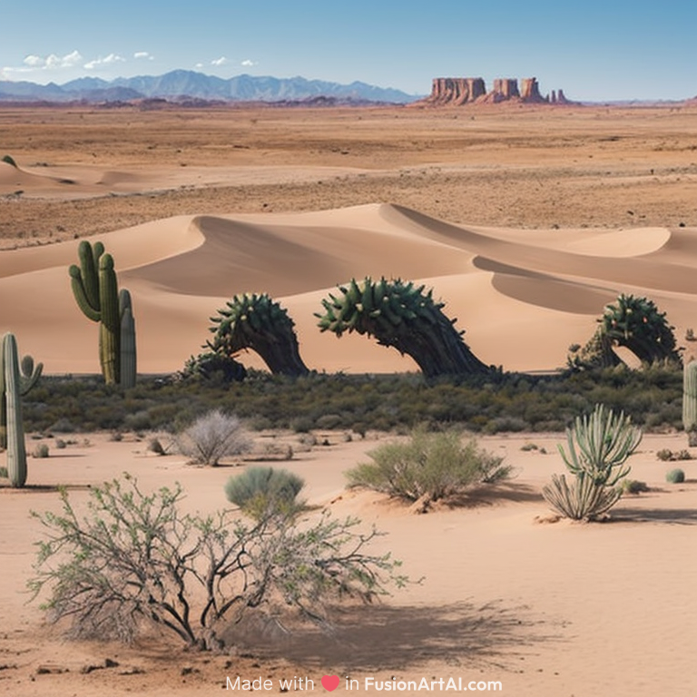 “A surreal desert landscape featuring several tall, weathered tree trunks shaped like distorted cactus forms. One trunk bends like a curved hook, another has multiple thick cylindrical branches resembling cactus arms, and another tree appears dry and twisted. The scene is set in an expansive sandy desert with distant mountains under a clear blue sky. Highly detailed, realistic textures, sharp shadows, natural lighting, ultra-realistic photography.”