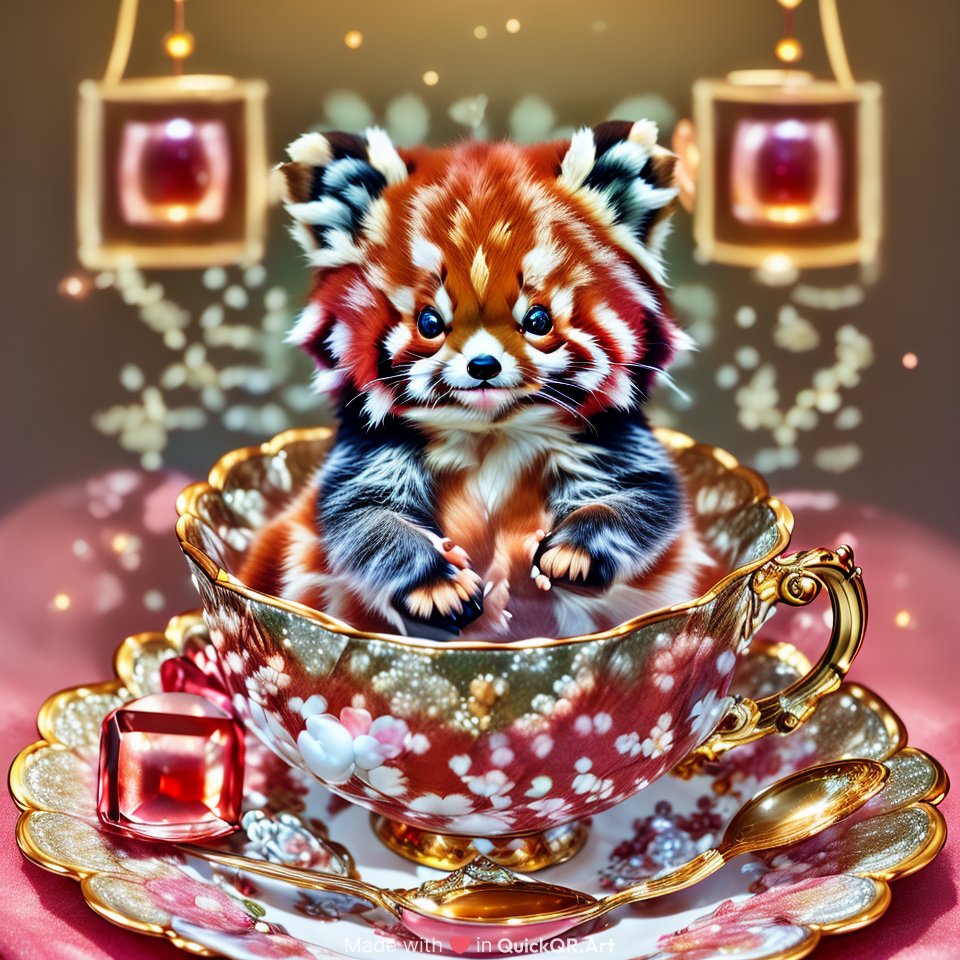 'A tiny, hyper-realistic baby red panda with oversized sparkling eyes, sitting in a soft teacup, fluffy fur, pastel aesthetic, cinematic lighting, extremely cute and high detail